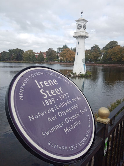 A Purple Plaque was unveiled today on Roath Park Lake promenade in honour of Irene Steer the first Welsh woman to win an Olympic Gold medal in Stockholm in 1912. She lived and went to school on The Parade, learnt to swim in Guilford Crescent baths and practised in Roath Park Lake. After the unveiling and the speeches and reception, a group of family members visited the grave in Cathays Cemetery and laid some flowers. Her gold medal even made an appearance too.